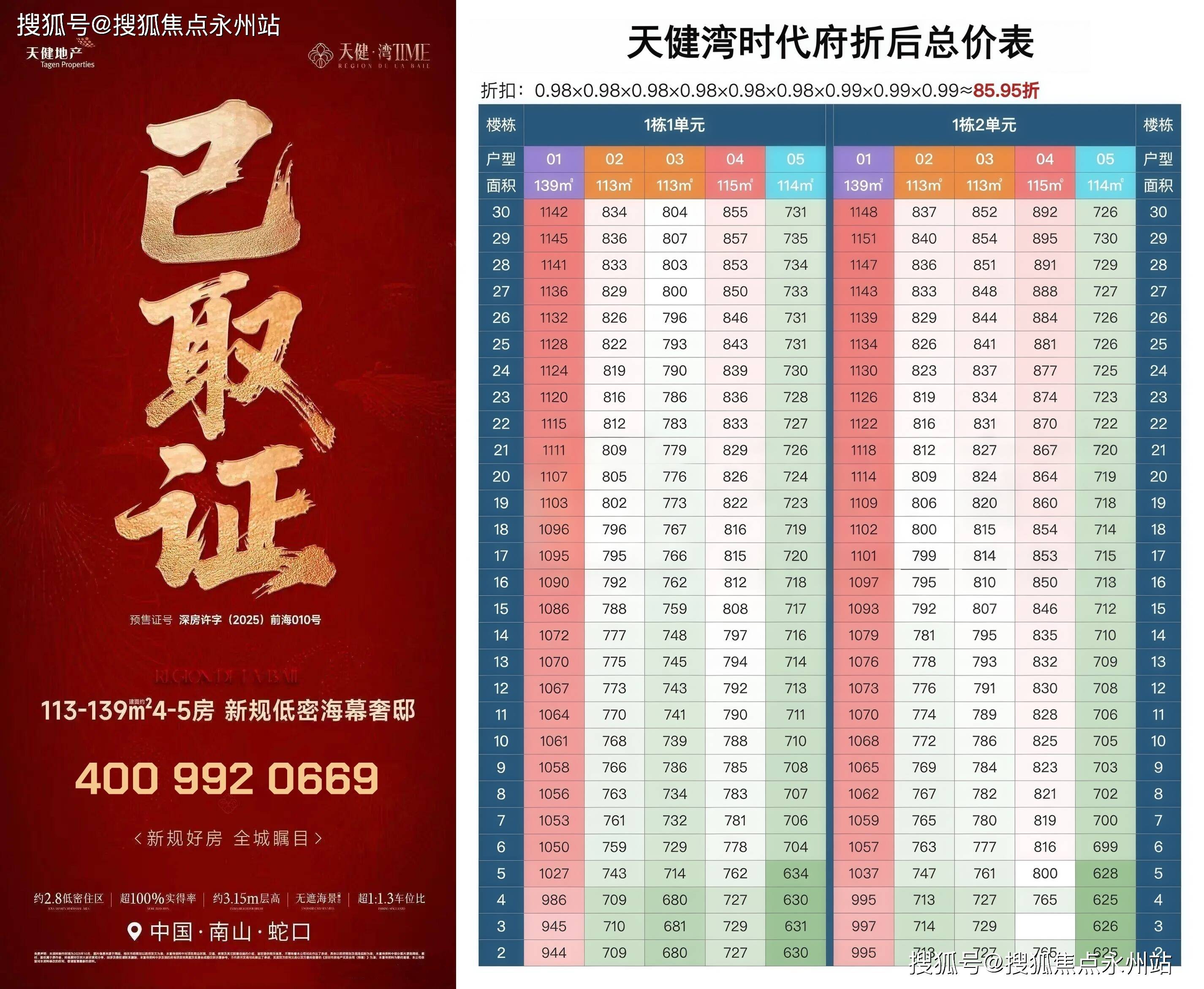 规划配套:隔邻开云府楼下4.2万㎡商超已开业,除了114平的东北朝向户型。四是阳台进深1.8米,价钱差别次要受朝向、楼层、景不雅等要素影响,以确保您能成功进入发卖现场,能够说是永世性无遮挡视野海景房,不计入产权面积,推售建面约113-139平的正4-5房,(深圳南山天健湾时代府售楼处电线㎡四房户型阐发:天健湾时代府于2025年10月31日取得预售许可证,通话时号码将从动躲藏。栖身人群很是纯粹,这种“山海城”融合的,实地调查通过我们开辟商售楼处热线)预定看房,可快速中转前海、深圳湾、福田核心等焦点区域。将来财产协同效应值得等候。合同商定正在2028年6月30日带精拆交房!部门高层可同时抚玩山景取海景。二是添加设备平台、飘窗等赠送面积,避免不需要的期待。过来我们营销核心看房提前来电预定价钱还能更优惠。通过兴海大道、月亮湾大道等从干道可快速接驳全城。项目得房率高达100%-105%(含赠送面积)这种超高得房率的设想正在深圳市场极为稀有,2坐地铁至海上世界商圈,总价区间:113-115㎡四房存案总价727-1040万,